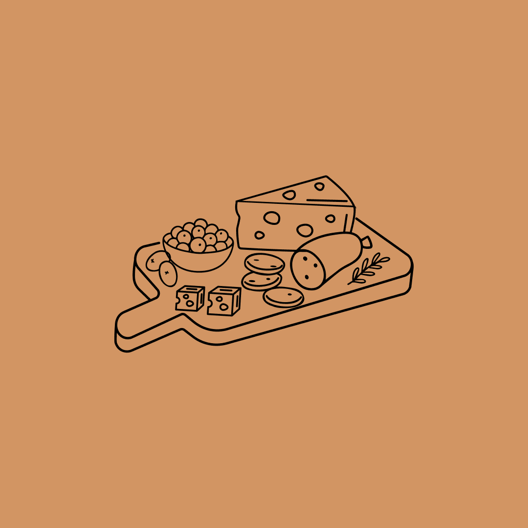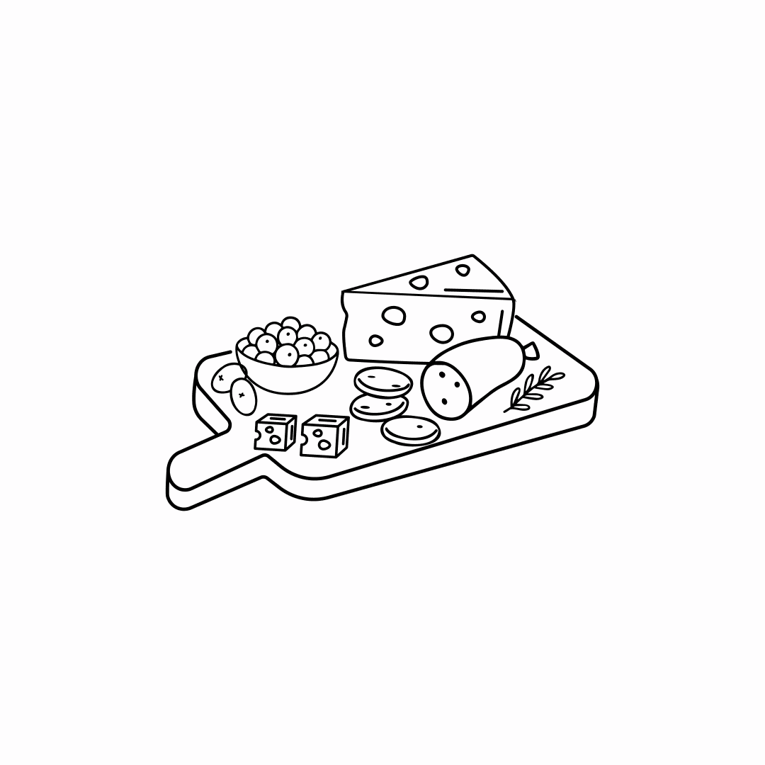 Pão, mini tostas, mini gressinos, crackers c/ sal, queijo flamengo, queijo castelões, queijo cheddar, queijo brie, presunto, chourição, coppa, fiambre, uvas brancas, tomates cherry, azeitonas, compota de morango, nozes, pistácios